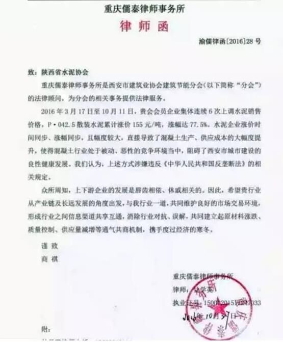 10月27日,鑒于陜西省內(nèi)水泥市場及混凝土市場發(fā)展情況,西安市建筑業(yè)協(xié)會建筑節(jié)能分會認(rèn)為這一市場情況違法了《中華人民共和國反壟斷法》的相關(guān)規(guī)定,并向陜西省水泥協(xié)會發(fā)律師函。希望水泥行業(yè)從產(chǎn)業(yè)鏈及長遠(yuǎn)發(fā)展的角度出發(fā),與混凝土行業(yè)一道,共同維護(hù)良好的市場交易環(huán)境,形成行業(yè)之間信息渠道共享互通,消除行業(yè)對抗、誤解,共同建立起原材料漲跌,質(zhì)量控制、供應(yīng)量減增等通氣共商機(jī)制,攜手度過經(jīng)濟(jì)寒冬。