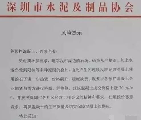 調(diào)價函表示,近段時間,受毗鄰周邊石場,碼頭管治,加上水運受到一定限制等多種因素影響,導致珠三角周邊地區(qū)礫石極度緊缺直接影響價格成本上漲,造成混凝土生產(chǎn)直接成本增加70元/立方以上,混凝土公司已無力承擔由于原材料價格急劇上漲造成的巨額虧損,為確?;炷恋恼9?,從2016年12月13日起,在實際結(jié)算價的基礎上上調(diào)70元/立方(以C30為準,其他等級同比調(diào)整)。