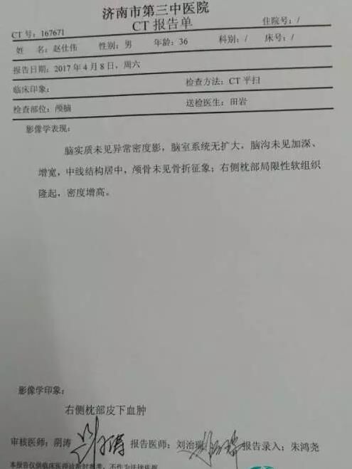 濟南市第三中醫(yī)院CT報告單顯示,趙先生右側(cè)枕部局限性軟組織隆起,密度增高。趙先生的同事周先生對記者說:“看著朋友被打成這樣,我心里很過意不去,所以我現(xiàn)在到醫(yī)院照顧他。”