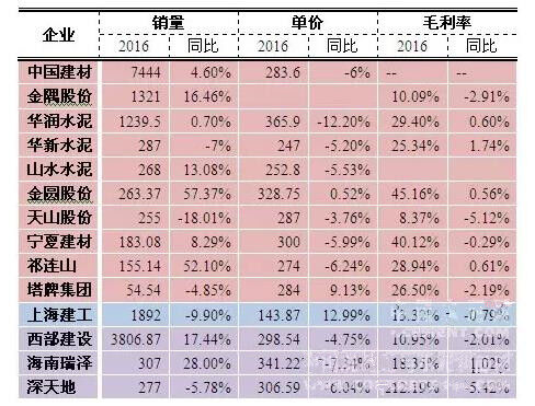 2016年,全國(guó)商品混凝土產(chǎn)量17.9億立方米,同比增長(zhǎng)7.4%,混凝土與水泥制品行業(yè)實(shí)現(xiàn)利潤(rùn)總額658億元,同比增長(zhǎng)4.1%。從上市企業(yè)來(lái)看,14家由混凝土業(yè)務(wù)經(jīng)營(yíng)的企業(yè)總銷(xiāo)量同比增長(zhǎng)6.25%,但由于大部分企業(yè)混凝土銷(xiāo)售價(jià)格出現(xiàn)回落,導(dǎo)致13家企業(yè)(除金隅股份)整體銷(xiāo)售收入同比只有1.25%的提升,而11家企業(yè)(除中國(guó)建材、金隅股份、山水水泥)整體毛利潤(rùn)同比下滑3.3%。