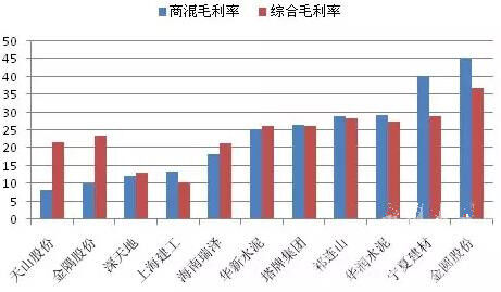 圖2:各企業(yè)2016年商混業(yè)務(wù)毛利率與公司整體毛利率水平比較(%)