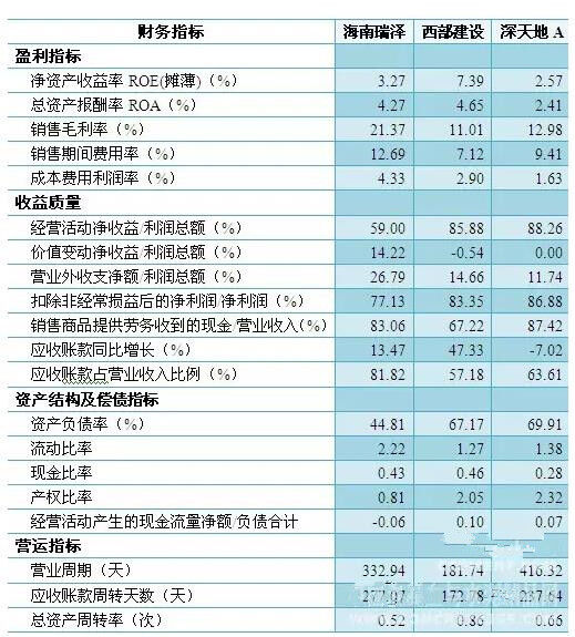 西部建設(shè)、深天地的資產(chǎn)負(fù)債率復(fù)合行業(yè)平均水平,海南瑞澤負(fù)債率較低,償債風(fēng)險(xiǎn)偏低,同時(shí)其他償債指標(biāo)也顯示海南瑞澤具有較低的債務(wù)風(fēng)險(xiǎn),但由于經(jīng)營(yíng)活動(dòng)產(chǎn)生的現(xiàn)金凈流量為負(fù)值,因此主營(yíng)業(yè)務(wù)正常經(jīng)營(yíng)的償債能力較弱,有待提升業(yè)務(wù)正常經(jīng)營(yíng)的穩(wěn)定性和盈利能力。