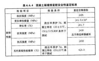 對(duì)于裂縫修補(bǔ)材料來(lái)說(shuō),其材料的安全性能指標(biāo),必須符合GB50728-2011《工程結(jié)構(gòu)加固材料安全性鑒定技術(shù)規(guī)范》的規(guī)定: