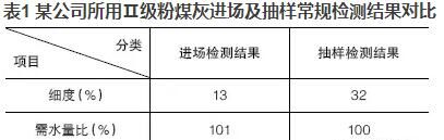 優(yōu)質(zhì)的粉煤灰摻入混凝土可明顯地改善混凝土的和易性,當(dāng)粉煤灰摻量大于膠材總量的5%~10%時,效果極為明顯?,F(xiàn)今在混凝土實際生產(chǎn)中,粉煤灰摻量往往達到20%,有的甚至高達30%,但混凝土的和易性卻不盡人意。抽取原材料進行檢測時,發(fā)現(xiàn)粉煤灰的檢測結(jié)果經(jīng)常不滿足標(biāo)準(zhǔn)要求或者與驗收時的結(jié)果相差甚遠。現(xiàn)以某公司所用Ⅱ級粉煤灰進場及抽樣常規(guī)檢測結(jié)果進行對比,見表1。