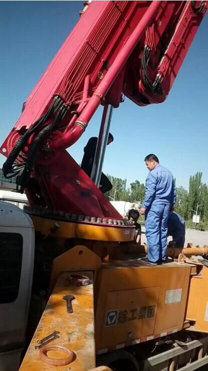 3、泵車就位后,應(yīng)支起支腿并保持機身的水平和穩(wěn)定。當(dāng)用布料桿送料時,機身傾斜度不得大于3°。