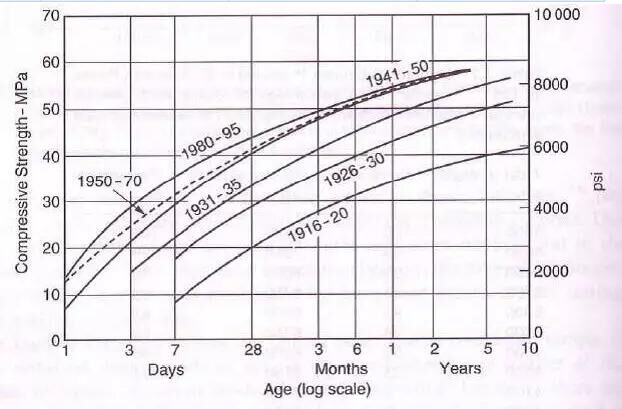 前28d齡期的水泥膠砂強(qiáng)度快速增長,導(dǎo)致28d強(qiáng)度與7d強(qiáng)度之比降低,這是由于C3S含量與C2S含量之比變大,受其水化速度影響。水泥膠砂28d強(qiáng)度與7d強(qiáng)度比值在低的水膠比時顯得更低。這種經(jīng)驗理論就導(dǎo)致現(xiàn)代水泥含有更多的堿,每個水泥廠家都暗自加堿,而且是不固定的,會根據(jù)客戶情況,應(yīng)付客戶的要求靈活加堿。在1923年,混凝土抗壓強(qiáng)度與齡期的對數(shù)成線性關(guān)系達(dá)到25或50年,這是使用高C2S含量、低細(xì)度的水泥配制混凝土的結(jié)果。在1937年,抗壓強(qiáng)度與齡期的對數(shù)成線性關(guān)系大約為10年,這是使用低C2S含量、高細(xì)度的水泥配制混凝土的結(jié)果。近年來,隨著關(guān)系更短。從圖3可以看出這種變化趨勢。