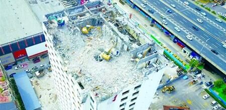 由于距居民樓和高架橋僅二三十米,明湖大酒店大樓未用爆破手段拆除,而是把挖掘機吊到18樓頂一層一層往下拆