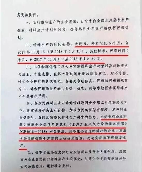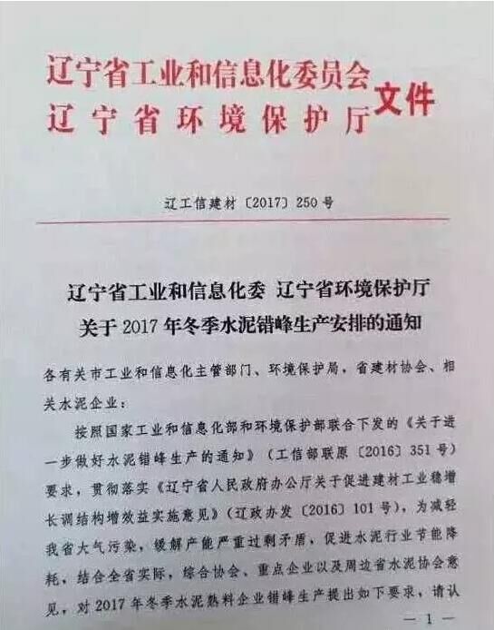 日前,遼寧省工信委和遼寧省環(huán)保廳聯(lián)合發(fā)文要求遼寧省水泥企業(yè)于今年11月開始啟動水泥行業(yè)采暖季錯峰停產(chǎn)計(jì)劃,除大連市以外的其他城市的全部水泥熟料生產(chǎn)企業(yè)錯峰停產(chǎn)6個月,錯峰生產(chǎn)自今年11月1日起停至明年春天4月末結(jié)束。
