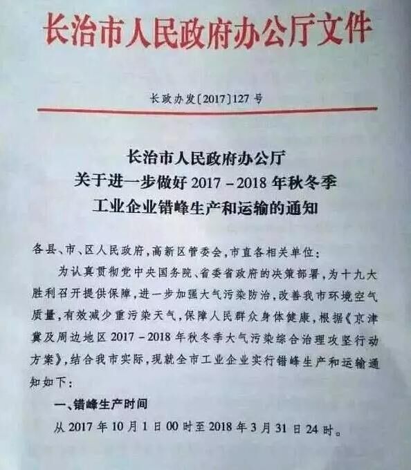 山西省長治市也發(fā)布《關(guān)于進(jìn)一步做好2017-2018秋冬季工業(yè)企業(yè)錯峰生產(chǎn)和運(yùn)輸?shù)耐ㄖ?。要求?017年10月1日00時起至2018年3月31日24時,水泥(含粉磨站)等建材行業(yè)企業(yè)全部停產(chǎn)。
