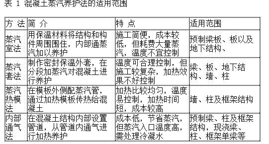 蒸汽法養(yǎng)護(hù)按照不同的加熱方式可以分為蒸汽室法、蒸汽套法、毛管模板法、蒸汽熱模法和內(nèi)部通氣法,其特點及使用的范圍見表 1。