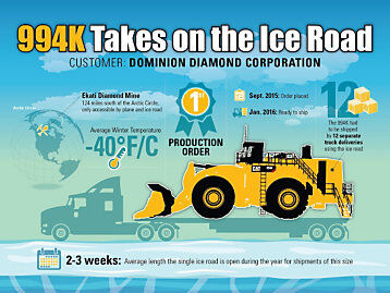 Carlos說(shuō):“通往Ekati礦山的這唯一一條冰路,每年的通行時(shí)間只有2-3周。因此,我們決心一定要及時(shí)把這臺(tái)994K運(yùn)送到客戶那里。如果錯(cuò)過(guò)了這個(gè)時(shí)間段,客戶就必須等到下一個(gè)冬天才能讓產(chǎn)品安全地通過(guò)冰道?!?