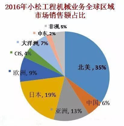 盡管每年有大筆收入來自中國,但小松工程機械業(yè)務最大的市場其實是北美,銷售額占比35%;中國銷售占比只有6%,還不如日本本土——19%。