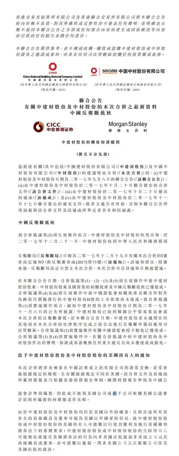 中國建材(03323)與中材股份(01893)聯(lián)合公布,2017年12月21日,中建材股份收到中國商務(wù)部反壟斷局日期為2017年12月19日有關(guān)此次合并的《審查決定通知》,經(jīng)審查后,反壟斷局決定不禁止此次合并,此次合并可自該通知日期起實施。