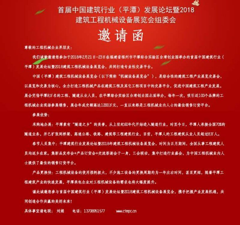 2018年2月21日-23日在福建省福州市平潭綜合實(shí)驗(yàn)區(qū)臺(tái)灣創(chuàng)業(yè)園舉辦的首屆中國建筑行業(yè)(平潭)發(fā)展論壇暨2018建筑工程機(jī)械設(shè)備展覽會(huì),共同打造專業(yè)性交易平臺(tái)。