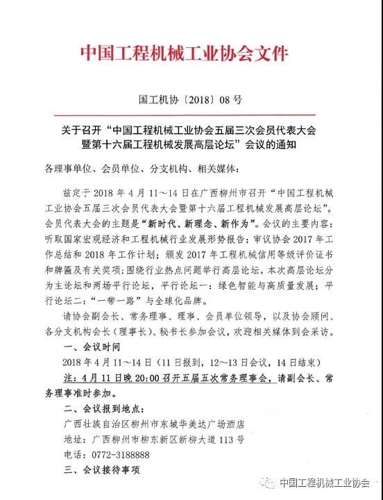 中國(guó)工程機(jī)械工業(yè)協(xié)會(huì)茲定于2018年4月11~14日在廣西柳州市召開“中國(guó)工程機(jī)械工業(yè)協(xié)會(huì)五屆三次會(huì)員代表大會(huì)暨第十六屆工程機(jī)械發(fā)展高層論壇”。會(huì)員代表大會(huì)的主題是“新時(shí)代、新理念、新作為”。