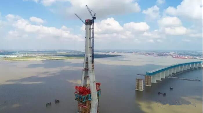 在國內(nèi),大部分橋梁主塔高度都在260米以下,300米以上極其少見,而本次完成施工的大橋北側(cè)主塔,建設(shè)整體高達330米,相當(dāng)于110層高樓,為國內(nèi)最高主塔,同時也是世界公鐵兩用斜拉橋中最高主塔;混凝土澆筑達7.3萬方,鋼筋1.1萬噸,體量也為世界最大。
