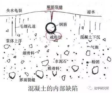 混凝土拌合物在攪拌后混合均勻,骨料下沉,混凝土中的游離水和輕物質上浮、氣泡逸出,泌出的水分在混凝土表面聚集,這是混凝土拌合物的保水性(粘聚性)不好,這個過程會在混凝土內部形成較多的缺陷,如: