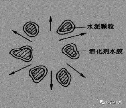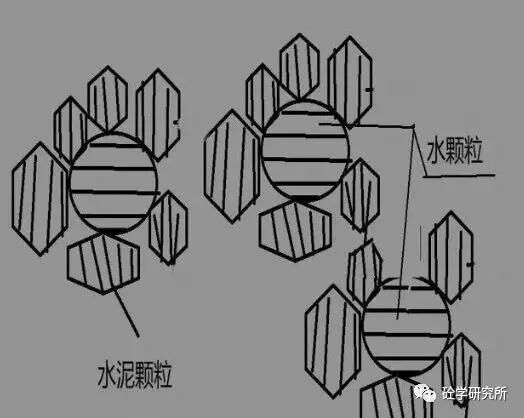 種水泥拌合物狀態(tài)為工地常見狀態(tài),也就是說一個水顆粒被N多的這個水泥顆粒包裹著。那么水泥顆粒與水泥顆粒之間有非常大的這個電子吸附效應,還有內摩角度。這樣同等用水量情況下混凝土看上去比較干燥,并且流動性不佳。