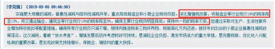昨日上午!總理在兩會最新報告明確:1、將制造業(yè)等行業(yè)原有16%增值稅稅率降為13%,將交通運輸、建筑、房地產(chǎn)等行業(yè)現(xiàn)行10%稅率降為9%,保持6%一檔稅率不變。2、下調(diào)城鎮(zhèn)職工基本養(yǎng)老保險單位繳費比例,各地可降至16%!不得自行對歷史欠費進行集中清繳!