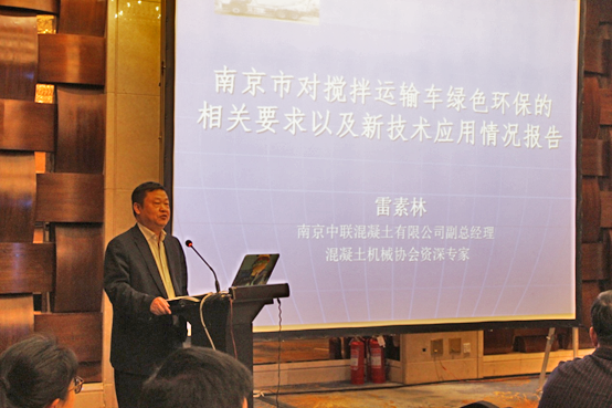 南京中聯(lián)混凝土有限公司副總經(jīng)理、混凝土機(jī)械協(xié)會資深專家雷素林先生作了《南京市對攪拌運輸車綠色環(huán)保的相關(guān)要求以及新技術(shù)應(yīng)用情況報告》的主題演講,從南京環(huán)保和攪拌車治理過程中所遇到的問題提出了攪拌車在綠色環(huán)保和新技術(shù)應(yīng)用方面的以下幾點建議: