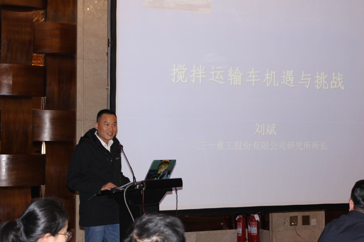三一重工股份有限公司研究所所長劉斌先生作了《攪拌運輸車機(jī)遇與挑戰(zhàn)》的主題報告,從攪拌車面臨的五大機(jī)遇和三大挑戰(zhàn)分析,提出攪拌車的研發(fā)與生產(chǎn)要回歸本質(zhì),即運輸和質(zhì)量,保證安全運輸、環(huán)保運輸、合標(biāo)運輸、保證運輸?shù)幕炷临|(zhì)量。