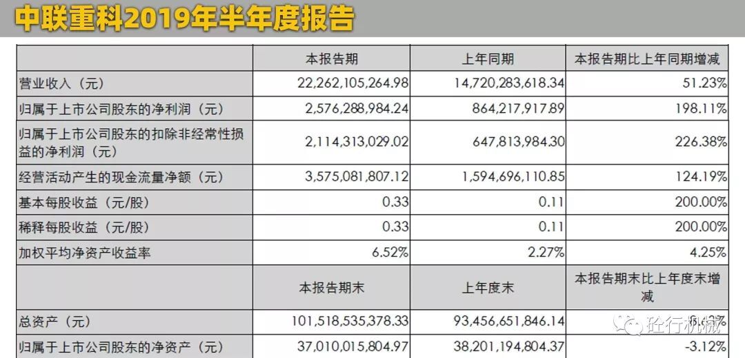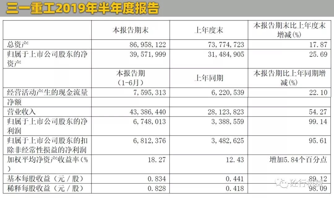 2019年上半年?duì)I業(yè)收入:222.62億元8月30日晚,中聯(lián)重科官方發(fā)布了2019年半年度報(bào)告。報(bào)告顯示,中聯(lián)重科上半年實(shí)現(xiàn)營業(yè)總收入222.6億元,同比增長51.23%;包括海外市場實(shí)現(xiàn)營業(yè)收入16.84億元,同比增長2.61%。歸屬于上市公司股東的凈利潤25.76億元,同比增長198.11%。相比較上面的徐工機(jī)械,雖然總營業(yè)額相差了88個(gè)多億,但是,凈利潤比徐工多了2.93億元。所以,從盈利能力來說,中聯(lián)表現(xiàn)比徐工要好。中聯(lián)重科的優(yōu)勢產(chǎn)業(yè)主要集中在混凝土機(jī)械、塔式起重機(jī)械、環(huán)衛(wèi)機(jī)械、農(nóng)業(yè)機(jī)械這四個(gè)領(lǐng)域?yàn)橹鳎渲?,建筑起重機(jī)械、長臂架泵車保持行業(yè)第一,汽車起重機(jī)國內(nèi)市場份額較年初增長6.8%。從目前中聯(lián)的發(fā)展趨勢來看,也在積極的擴(kuò)展高空作業(yè)平臺、土方機(jī)械、機(jī)制砂、干混砂漿、噴射機(jī)械手等新興業(yè)務(wù)。與此同時(shí),中聯(lián)重科目前也在積極轉(zhuǎn)型,打造人工智能和智能制造,中聯(lián)重科塔機(jī)智能工廠穩(wěn)步達(dá)產(chǎn),高空作業(yè)平臺臂式智能產(chǎn)線實(shí)現(xiàn)量產(chǎn),攪拌車智能制造產(chǎn)業(yè)園、液壓關(guān)鍵元件產(chǎn)業(yè)園處于規(guī)劃建設(shè)中。作為老牌的國產(chǎn)工程機(jī)械品牌,中聯(lián)重科一直以來擁有很好的品牌口碑,特別是在混凝土機(jī)械領(lǐng)域,擁有眾多的明星產(chǎn)品,碳纖維長臂架泵車,國內(nèi)首創(chuàng),大受市場歡迎。