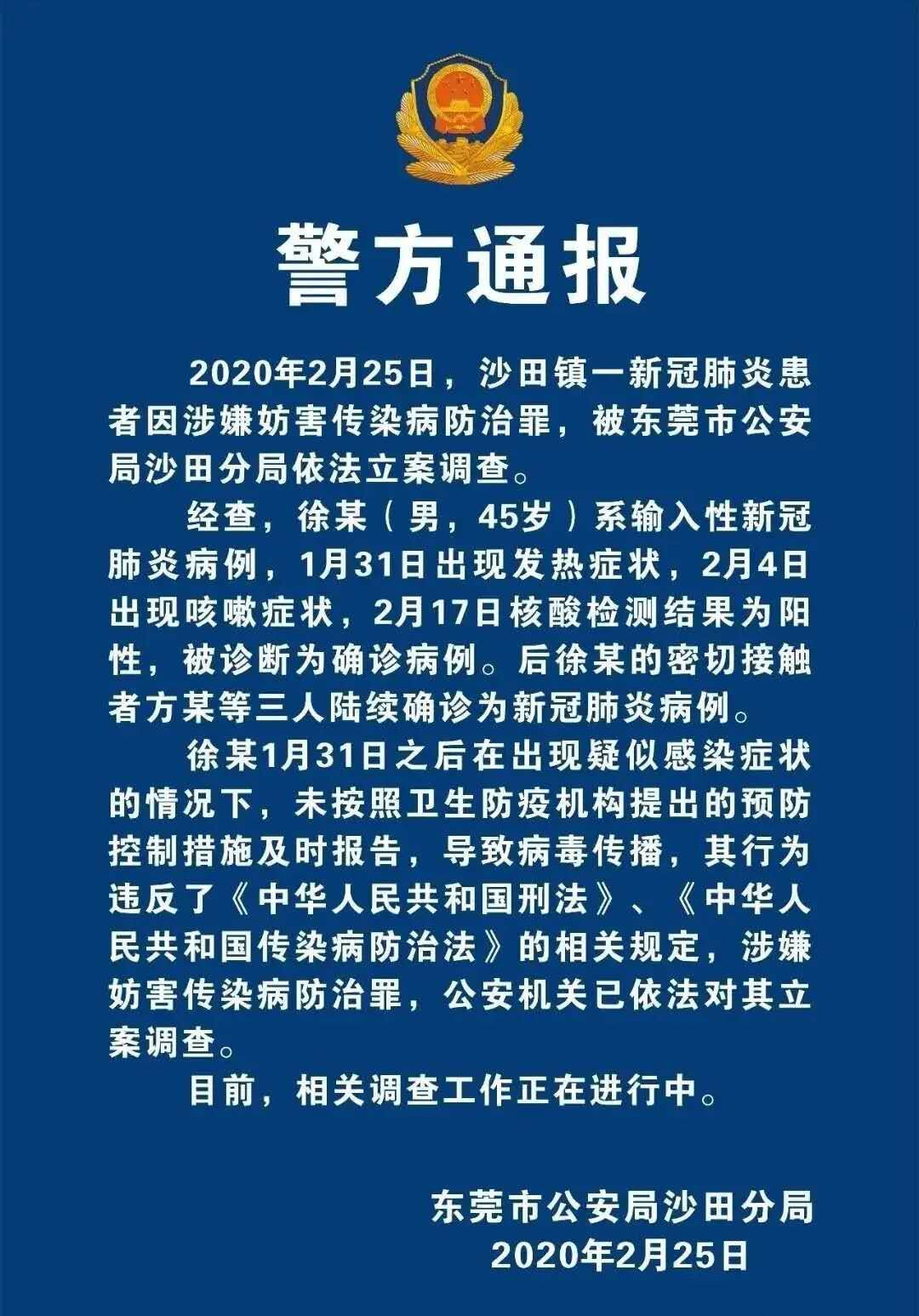 2月25日,東莞市公安局沙田分局發(fā)布《警方通報》,該工地徐某涉嫌妨害傳染病防治罪,被東莞市公安局沙田分局依法立案調(diào)查。