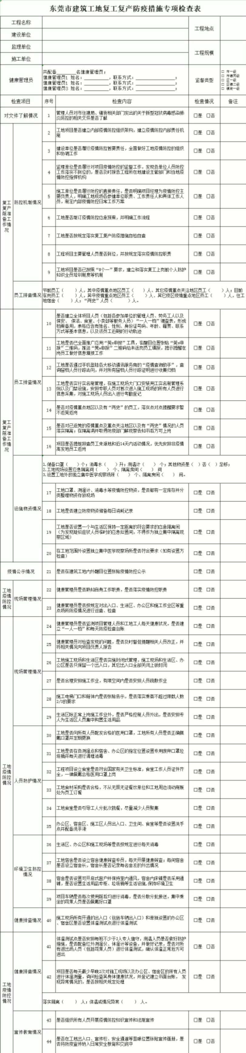 東莞市建筑工地復工復產(chǎn)防疫措施專項檢查表