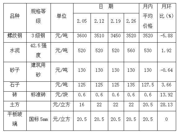 受春節(jié)假期和新冠肺炎疫情影響,2月份山東省濟(jì)寧市黃河灘區(qū)遷建物資市場(chǎng)交易量明顯減少,價(jià)格變動(dòng)整體漲跌互現(xiàn)。與上月相比,7種黃河灘遷建物資價(jià)格呈4升2降1平態(tài)勢(shì)。其中,螺紋鋼的價(jià)格震蕩下行,水泥的價(jià)格穩(wěn)中有漲,砂子、磚和平板玻璃的價(jià)格月內(nèi)平穩(wěn)運(yùn)行,石子的價(jià)格受季節(jié)性供應(yīng)減少影響小幅上升,土方的價(jià)格呈現(xiàn)高位整理態(tài)勢(shì)。螺紋鋼方面,截止到2月26日,濟(jì)寧市梁山縣監(jiān)測(cè)的螺紋鋼市場(chǎng)批發(fā)價(jià)格為3520元/噸,價(jià)格下降明顯。由于目前特殊時(shí)期,貨運(yùn)受阻且下游企業(yè)復(fù)工進(jìn)度開展緩慢,短期內(nèi)需求仍然偏弱,市場(chǎng)整體成交冷清,庫(kù)存和資金壓力逐步增加,供給壓力放大,商家對(duì)于后市心態(tài)偏空,處于悲觀情緒,市場(chǎng)整體處于有價(jià)無(wú)市狀態(tài)。
