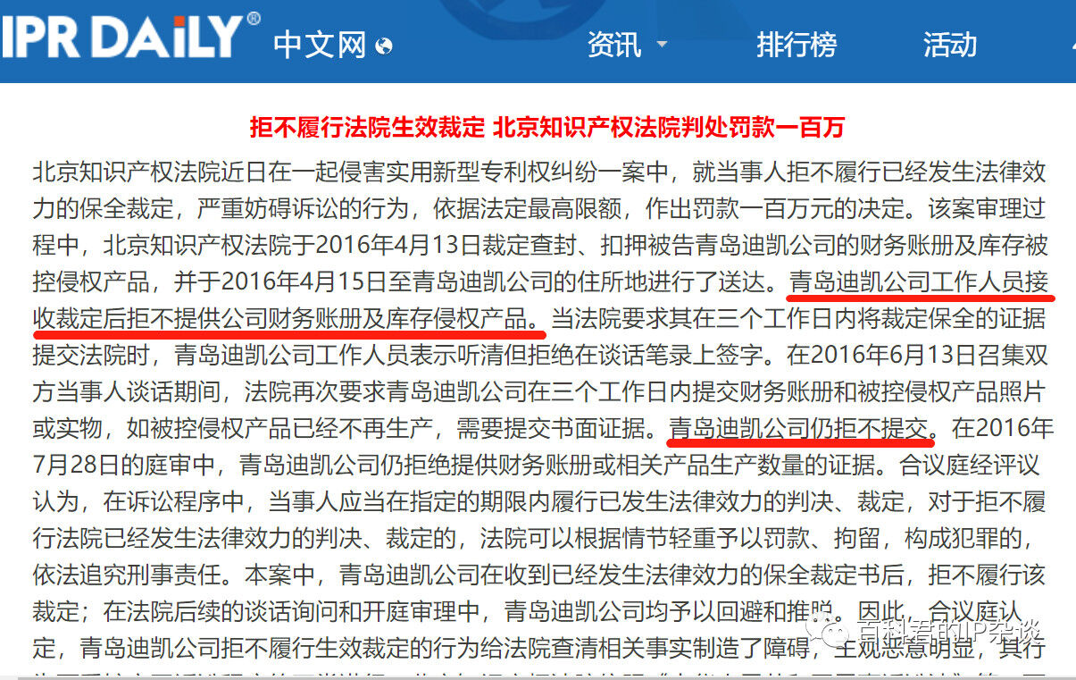 具體點就是,迪凱公司無正當理由,拒絕按照保全裁定提供相關(guān)證據(jù)(甚至還曾被判處罰款100萬),應(yīng)當承擔(dān)相應(yīng)的不利后果,從而推定上述主張成立。