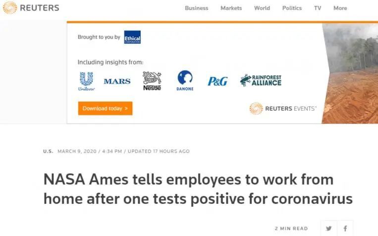 據(jù)路透社3月9日報道,美國國家航空航天局(NASA)位于加利福尼亞州的艾姆斯研究中心3月8日發(fā)表聲明稱,該中心一員工新冠病毒檢測呈陽性。出于謹(jǐn)慎考慮,該中心要求其他員工在家工作,直到另行通知。