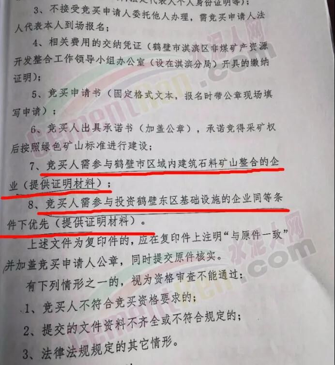但是,該企業(yè)在參與競標時確被駁回,理由是竟買人需參與鶴壁市區(qū)域內建筑石料礦山整合的企業(yè)(提供證明材料);同時要滿足競買人需參與投資鶴壁東區(qū)基礎設備的企業(yè)同等條件優(yōu)先(提供證明材料)。不屬于鶴壁市的企業(yè)或者沒有參于鶴壁市區(qū)域礦山整合的企業(yè)是不能參與競標,這與公告中的強調的價高者得完全不符。