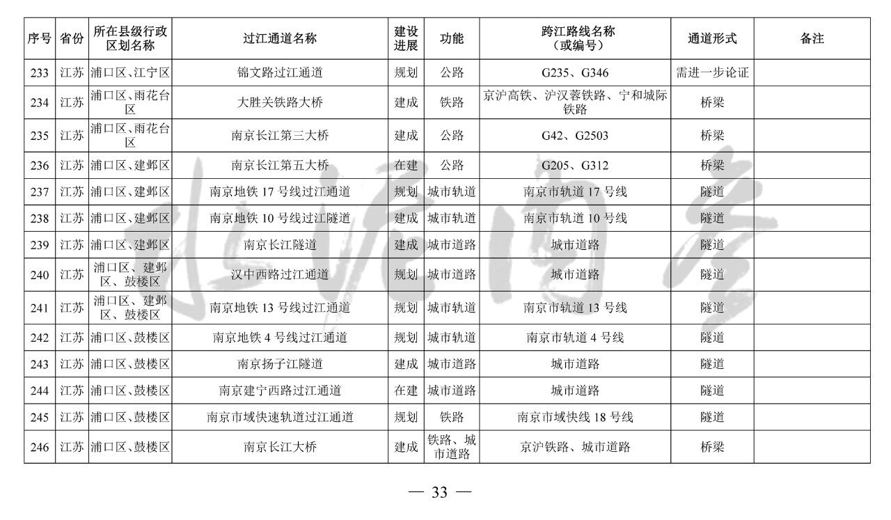 江蘇省(13座):錦文路過江通道、南京地鐵4號線過江通道、南京市域快速軌道過江通道、南京上元門過江通道、南京七鄉(xiāng)河過江通道、龍?zhí)堕L江大橋、寧儀城際鐵路過江通道、潤揚第二過江通道、江陰第二過江通道、江陰第三過江通道、張皋過江通道、蘇通第二過江通道、海太過江通道
