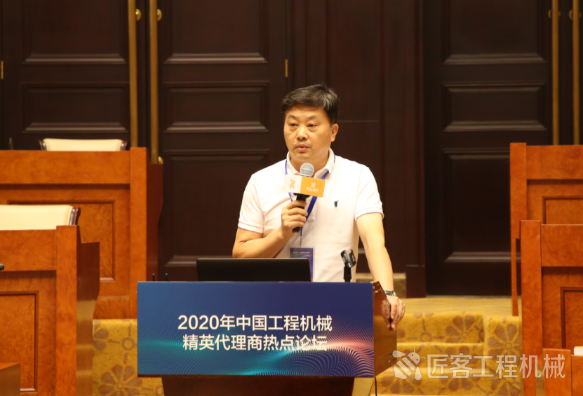 中國(guó)工程機(jī)械工業(yè)協(xié)會(huì)代理商工作委員會(huì)秘書長(zhǎng)、匠客工程機(jī)械傳媒總經(jīng)理?xiàng)钪痉贾鞒稚衔绲臅?huì)議并發(fā)言