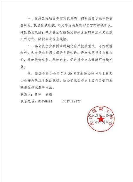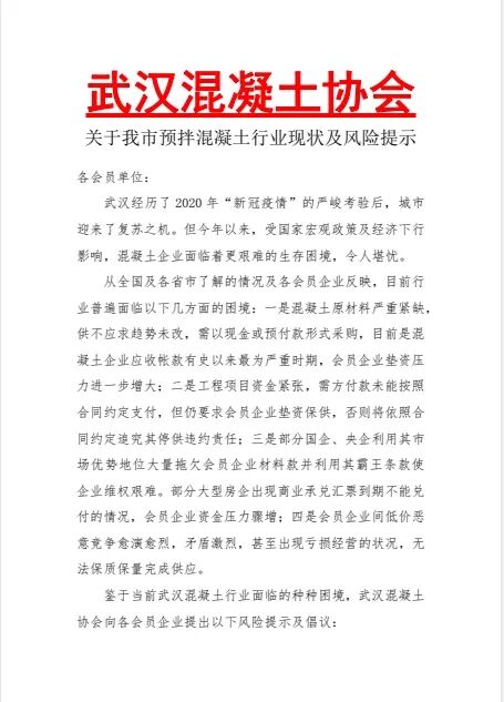 鑒于當(dāng)前武漢混凝土行業(yè)面臨的種種困境,武漢混凝土協(xié)會(huì)向各會(huì)員企業(yè)提出以下風(fēng)險(xiǎn)提示及倡議∶