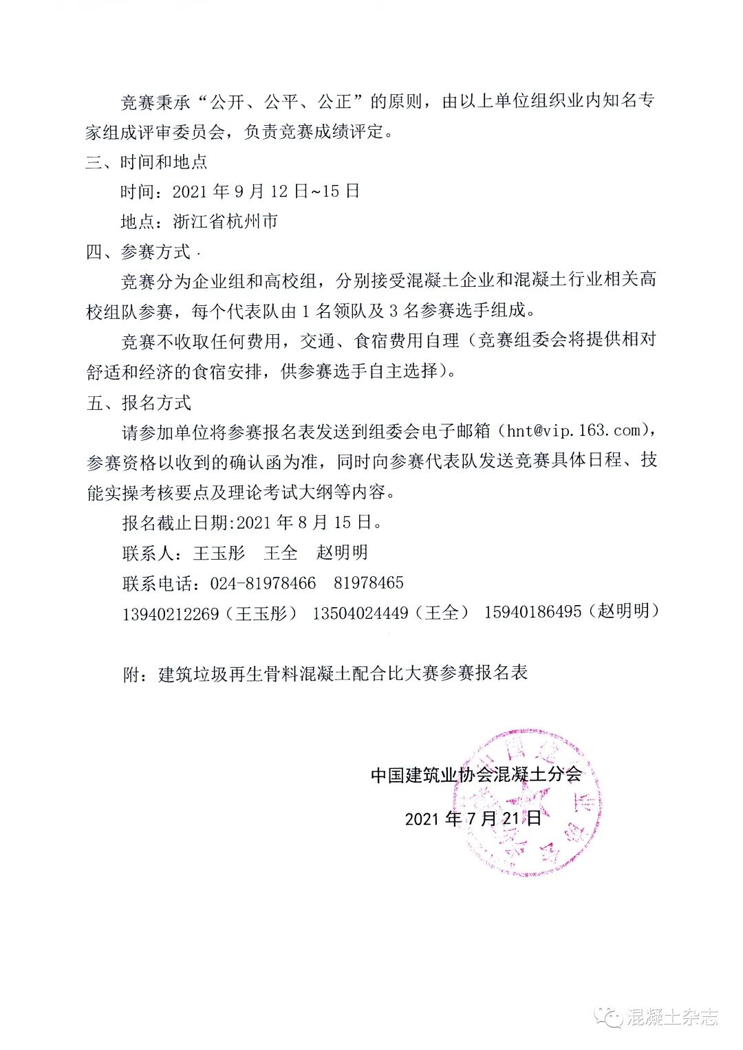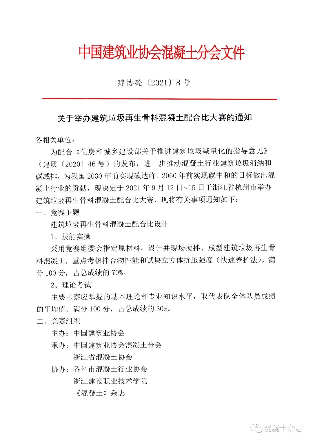 為配合《住房和城鄉(xiāng)建設(shè)部關(guān)于推進建筑垃圾減量化的指導意見》(建質(zhì)〔2020〕46號)的發(fā)布,進一步推動混凝土行業(yè)建筑垃圾消納和碳減排,為我國2030年前實現(xiàn)碳達峰、2060年前實現(xiàn)碳中和的目標做出混凝土行業(yè)的貢獻,現(xiàn)決定于2021年9月12日~15日于浙江省杭州市舉辦建筑垃圾再生骨料混凝土配合比大賽。