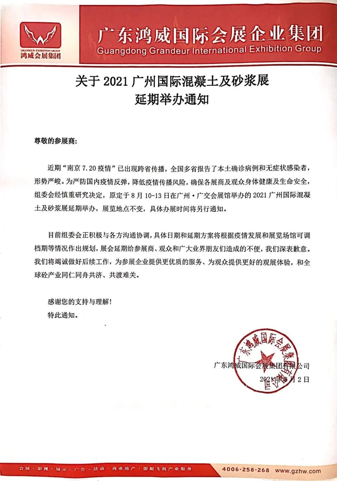 由于當(dāng)前國內(nèi)多地出現(xiàn)新型冠狀病毒肺炎新增確診病例、中高風(fēng)險地區(qū)不斷增加的疫情嚴(yán)峻形勢影響,為全力配合做好疫情防控工作,避免大規(guī)模聚集和降低疫情傳播風(fēng)險,保障參展商、觀眾及工作人員健康安全,維護參展單位權(quán)益,確保展會效果,組委會經(jīng)慎重研究決定,原定于8月10-13日在廣州·廣交會展館舉辦的2021廣州國際混凝土及砂漿展延期舉辦,展覽地點不變,具體辦展時間將另行通知。