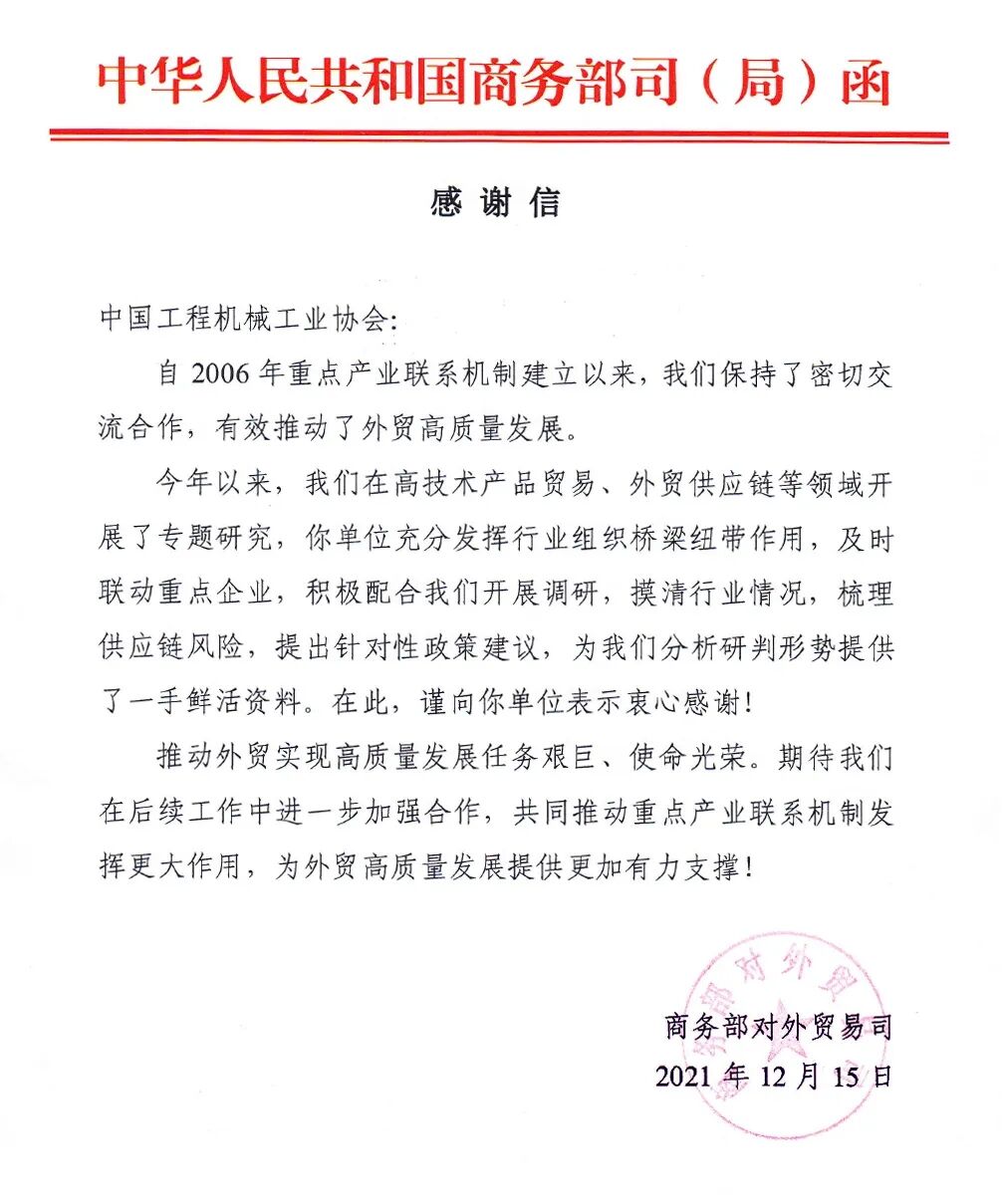 近日,商務部對外貿易司致函中國工程機械工業(yè)協(xié)會,就協(xié)會今年以來,積極配合商務部對外貿易司在高技術產品貿易、外貿供應鏈等領域開展了專題研究,收集、整理了大量的行業(yè)外貿進出口情況,受到了高度的肯定。并指出,協(xié)會充分發(fā)揮行業(yè)組織橋梁紐帶作用,及時聯(lián)動重點企業(yè),積極配合商務部對外貿易司開展調研,摸清行業(yè)情況,梳理供應鏈風險,提出針對性政策建議,為商務部對外貿易司分析研判形勢提供了一手鮮活資料。在此,謹向協(xié)會表示衷心感謝!