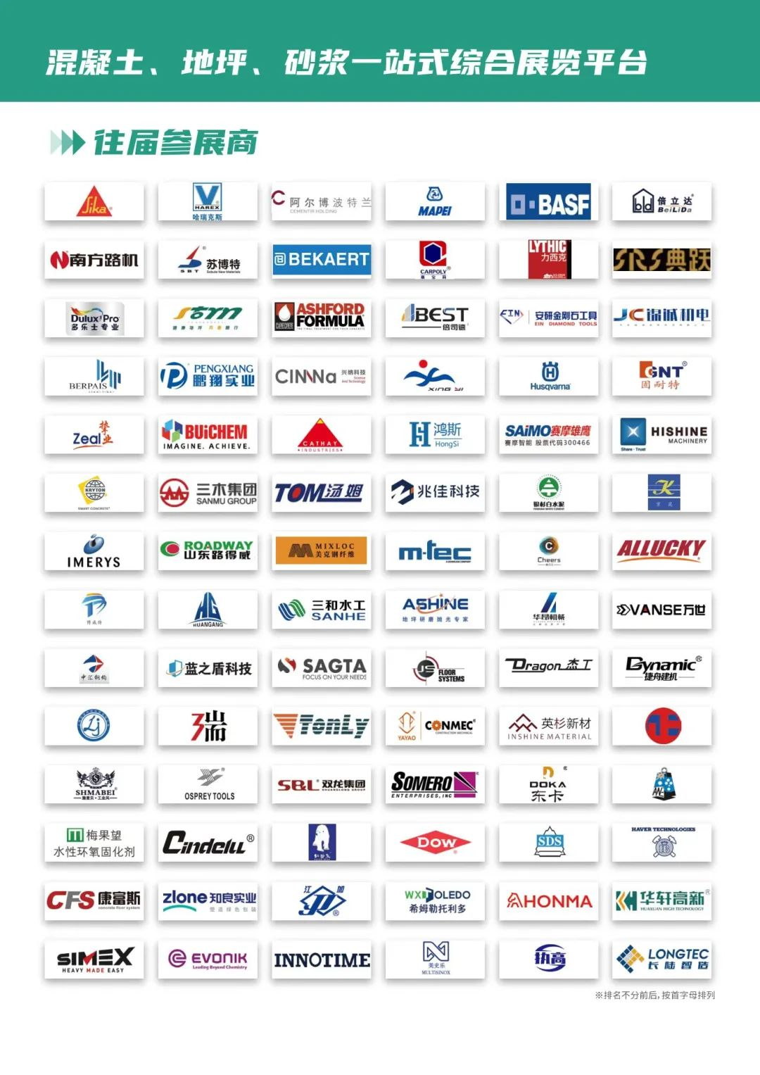 展品范圍:攪拌設(shè)備;混凝土運輸;現(xiàn)澆混凝土;預(yù)制混凝土;混凝土預(yù)制產(chǎn)品等;混凝土切割設(shè)備,破碎設(shè)備,爆破技術(shù)等;耗材;礦山設(shè)備;廢棄混凝土再生處理設(shè)備及產(chǎn)品;混凝土外加劑;混凝土檢測儀器及設(shè)備;混凝土加固技術(shù)及設(shè)備;裝飾混凝土及顏料等;透水磚;水泥