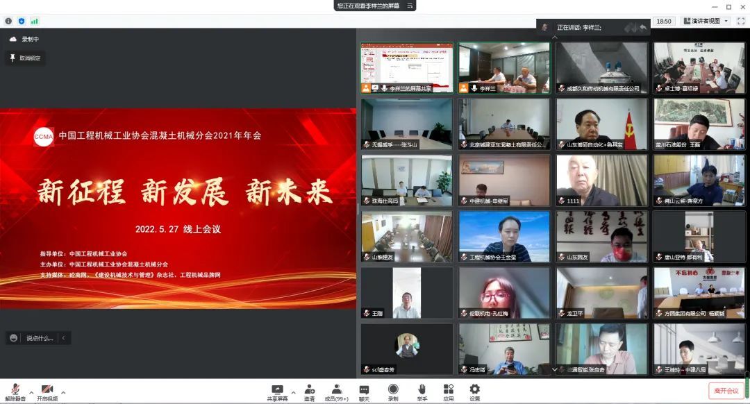 2022年5月27日,以“新征程 新發(fā)展 新未來 ”為主題的中國工程機械工業(yè)協(xié)會混凝土機械分會年會在線上隆重召開。中國工程機械工業(yè)協(xié)會會長蘇子孟、名譽會長祁俊、協(xié)會顧問龍國鍵、副秘書長呂瑩、副秘書長王金星、副秘書長尹曉荔、其他分支機構領導、混凝土機械分會會長符忠軒、名譽會長盛春芳、秘書長李祥蘭、顧問易君、分會秘書處、分會理事及會員單位相關負責人、行業(yè)上下游企業(yè)與行業(yè)專家等在內(nèi)的兩百余人參與此次會議。
