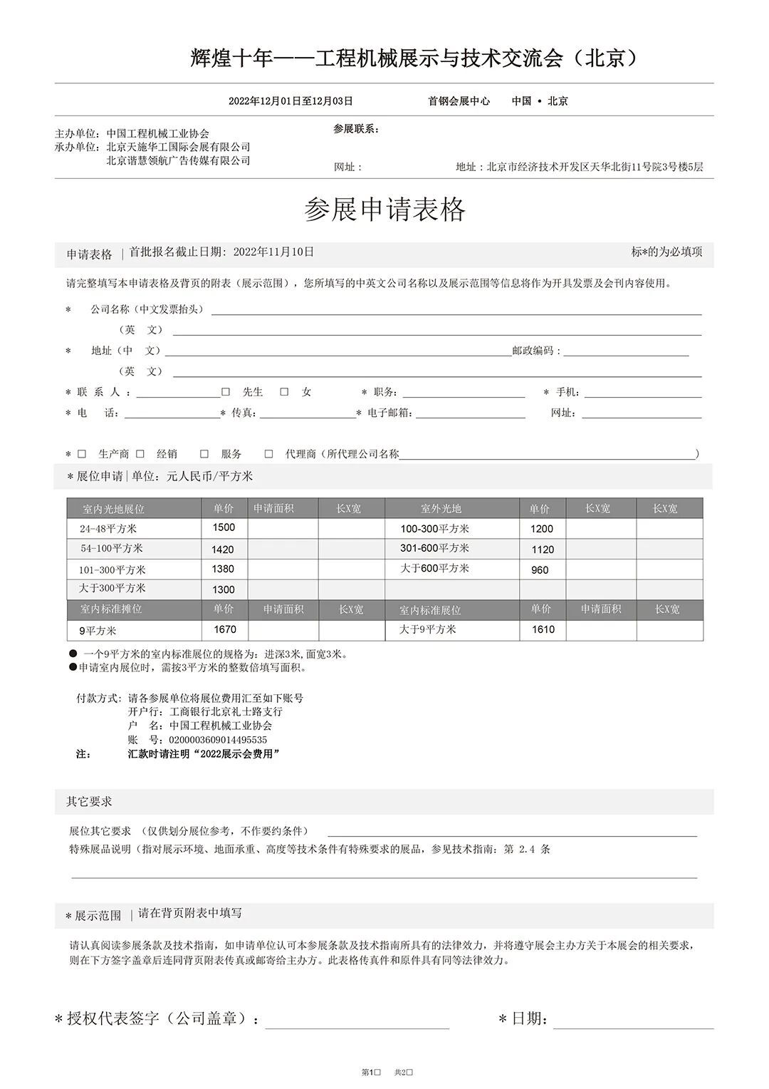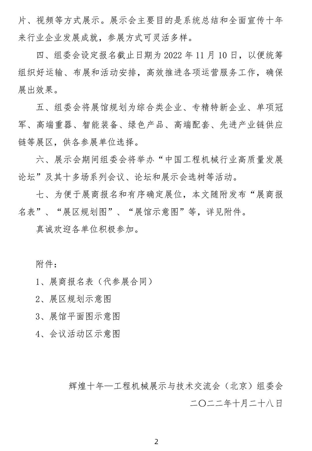 自協(xié)會(huì)發(fā)布舉辦“輝煌十年——工程機(jī)械展示與技術(shù)交流會(huì)(北京)”(以下簡稱“展示會(huì)”)通知后,得到了各參展單位的快速響應(yīng)和積極支持,有的已經(jīng)報(bào)名大面積參展,有的正在履行審批程序或來電表示參加展出,組委會(huì)深表衷心感謝!為及時(shí)傳遞展會(huì)信息,服務(wù)好廣大展商,辦好本次展示會(huì),現(xiàn)向廣大展商正式發(fā)出邀請,并將有關(guān)展示會(huì)方案說明如下:一、為充分展示黨的十八大以來工程機(jī)械行業(yè)各領(lǐng)域取得的發(fā)展成就,協(xié)會(huì)研究決定召開本次展示會(huì),邀請廣大協(xié)會(huì)會(huì)員和產(chǎn)業(yè)鏈上下游企業(yè)參展,共同分享企業(yè)發(fā)展成就和謀劃行業(yè)美好未來。二、展示會(huì)于2022年12月1日至3日在北京冬奧會(huì)滑雪大跳臺(tái)項(xiàng)目舉辦地——北京首鋼會(huì)展中心舉辦。屆時(shí)協(xié)會(huì)將邀請政府部門、相關(guān)用戶、媒體朋友和廣大觀眾到展示會(huì)現(xiàn)場參觀交流。12月3日(周六)實(shí)施社會(huì)公眾開放日,讓社會(huì)觀眾充分體驗(yàn)工程機(jī)械發(fā)展魅力。三、北京首鋼會(huì)展中心適合舉辦室內(nèi)高品質(zhì)展示會(huì),室外面積有限,而且適合承重較輕的產(chǎn)品展出。組委會(huì)初步規(guī)劃總展出面積2萬平米左右,希望各參展企業(yè)提供產(chǎn)業(yè)鏈上下游的先進(jìn)技術(shù)產(chǎn)品和高端裝備進(jìn)行展出,大型設(shè)備和示范工程應(yīng)用等可通過模型、圖片、視頻等方式展示。展示會(huì)主要目的是系統(tǒng)總結(jié)和全面宣傳十年來行業(yè)企業(yè)發(fā)展成就,參展方式可靈活多樣。四、組委會(huì)設(shè)定報(bào)名截止日期為2022年11月10日,以便統(tǒng)籌組織好運(yùn)輸、布展和活動(dòng)安排,高效推進(jìn)各項(xiàng)運(yùn)營服務(wù)工作,確保展出效果。五、組委會(huì)將展館規(guī)劃為綜合類企業(yè)、專精特新企業(yè)、單項(xiàng)冠軍、高端重器、智能裝備、綠色產(chǎn)品、高端配套、先進(jìn)產(chǎn)業(yè)鏈供應(yīng)鏈等展區(qū),供各參展單位選擇。六、展示會(huì)期間組委會(huì)將舉辦“中國工程機(jī)械行業(yè)高質(zhì)量發(fā)展論壇”及其十多場系列會(huì)議、論壇和展示會(huì)選樹等活動(dòng)。七、為便于展商報(bào)名和有序確定展位,本文隨附發(fā)布“展商報(bào)名表”、“展區(qū)規(guī)劃圖”、“展館示意圖”等,詳見附件。4、會(huì)議活動(dòng)區(qū)示意圖