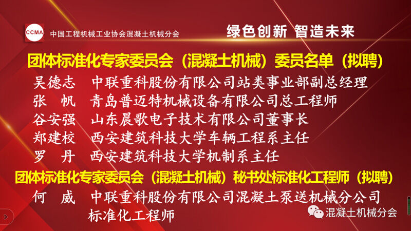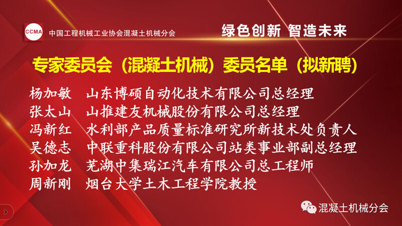 中國(guó)工程機(jī)械工業(yè)協(xié)會(huì)混凝土機(jī)械分會(huì)會(huì)長(zhǎng)符忠軒宣讀兩份通知。一份為《關(guān)于2022年中國(guó)工程機(jī)械工業(yè)協(xié)會(huì)專家委員會(huì)(混凝土機(jī)械)委員聘任的通知》,其中中國(guó)工程機(jī)械工業(yè)協(xié)會(huì)專家(混凝土機(jī)械)委員會(huì)(混凝土機(jī)械)續(xù)聘7位,新聘6位委員,共13位。
