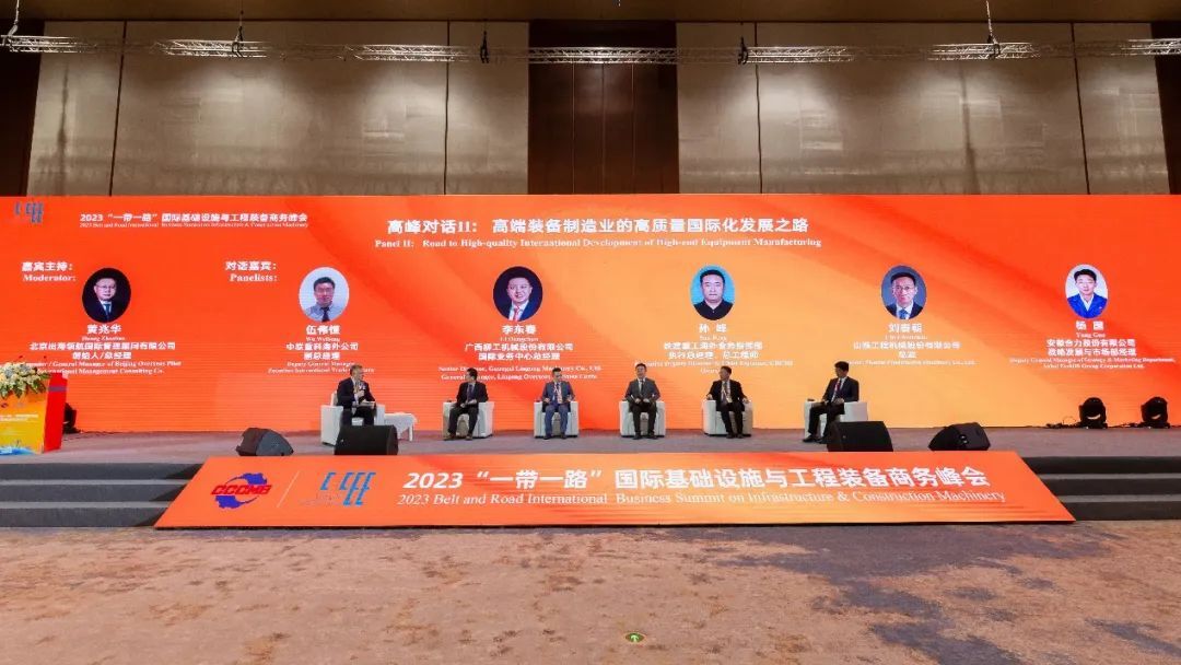 第二場高峰對話由北京出海領航國際管理顧問有限公司創(chuàng)始人、總經(jīng)理黃兆華主持,邀請中聯(lián)重科、廣西柳工、山推、鐵建重工、安徽合力公司高管,圍繞“高端裝備制造業(yè)的高質量國際化發(fā)展之路”展開對話交流,對話嘉賓聚焦后疫情時代國際基礎設施發(fā)展的機遇,分享工程裝備制造業(yè)高質量發(fā)展的經(jīng)驗和建議。