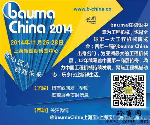 China 2014,11月25-28日行業(yè)翹楚絢麗登陸上海新國際博覽中心,工程機械行業(yè)產(chǎn)品全面細分展示??达L(fēng)云變幻,捕行業(yè)動向,我們相約bauma China 2014!