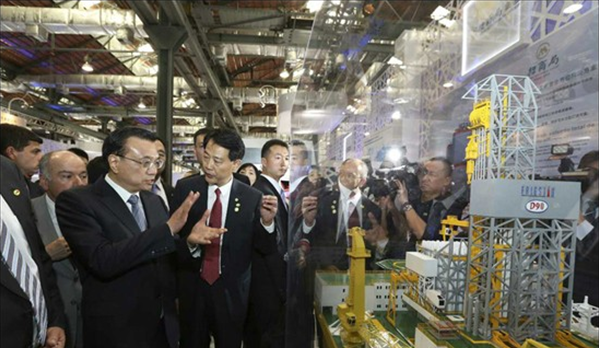 當(dāng)?shù)貢r(shí)間20日,李克強(qiáng)在里約熱內(nèi)盧州州長(zhǎng)佩藏和巴西外長(zhǎng)維埃拉的陪同下來(lái)到里約民港碼頭,參觀正在這里舉辦的中國(guó)裝備制造業(yè)展覽,并為展覽開幕剪彩。展覽包括鐵路及軌道交通、電力、通信、金融等10個(gè)板塊,代表國(guó)內(nèi)裝備制造業(yè)最高水平的30家中國(guó)企業(yè)參展。