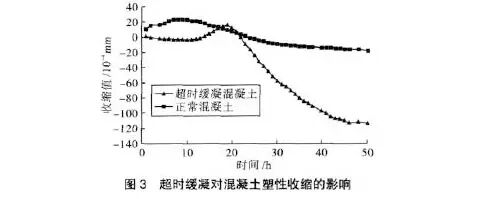 對(duì)比正常凝結(jié)混凝土和超時(shí)緩凝混凝土的收縮變形曲線(見圖3),可以發(fā)現(xiàn)超時(shí)緩凝混凝土的塑性收縮顯著高于正常凝結(jié)混凝土,這是由于超時(shí)緩凝混凝土的凝結(jié)時(shí)間很長(zhǎng),長(zhǎng)時(shí)間處于塑性狀態(tài),和易性又差,水分比正常凝結(jié)混凝土更容易散失,且水分散失的時(shí)間更長(zhǎng)。因此,發(fā)生超時(shí)緩凝現(xiàn)象的混凝土后應(yīng)加強(qiáng)混凝土的養(yǎng)護(hù),尤其是在混凝土表面覆蓋保護(hù)以防止混凝土水分過量散失。