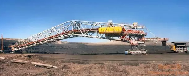 排土能力達(dá)到34000噸/小時(shí),臂長超過120米。皮帶排土機(jī)為移動(dòng)式連續(xù)工作的排料設(shè)備,它們將來自可移動(dòng)梯段皮帶運(yùn)輸機(jī)的物料排卸在料堆上,借助皮帶轉(zhuǎn)載車和皮帶滑行轉(zhuǎn)載車將物料輸送到排土機(jī)。排土機(jī)有能力堆高低地、作為行駛路面的平盤,以便隨后用做新采區(qū)的卸料、堆高。除此之外,還可以使用一部皮帶排土機(jī)為可移動(dòng)梯段皮帶運(yùn)輸機(jī)堆起一個(gè)高平面。說白了,它就是一個(gè)堆土的設(shè)備嘍~