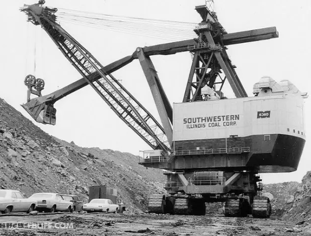 這個(gè)電鏟1965年問世,組裝它花了約兩年時(shí)間,最終的建造費(fèi)用在當(dāng)時(shí)超過1500萬美元,在美國Southwestern Illinois的“Captain”露天煤礦使用,其高度相當(dāng)于21層樓,使用7000V的高壓電,行走裝置為8條履帶,斗臂長度為41米,最大挖掘高度67.2 m,是迄今全球最大的電鏟,因火災(zāi)毀損于1992年爆破拆解,一生的挖掘量達(dá)到6億2千萬方。沒有見證這一奇跡真是遺憾吶~