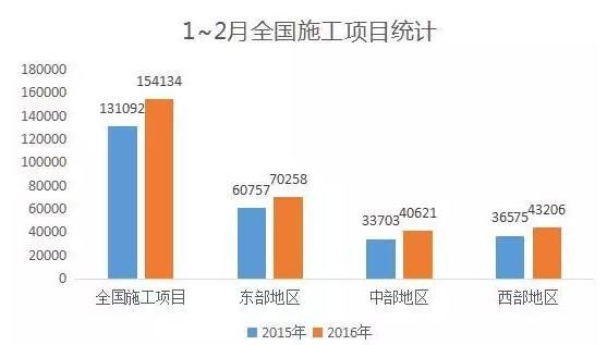 今年1~2月,全國施工項目154134個,比去年同期增加23042個。其中,東部地區(qū)施工項目70258個,增加9501個;中部地區(qū)施工項目40621個,增加6918個;西部地區(qū)施工項目43206個,增加6631個。