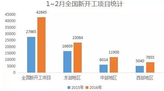 今年1~2月,全國新開工項目42845個,比去年增加15180個。其中,東部地區(qū)新開工項目23084個,增加6475個;中部地區(qū)新開工項目11900個,增加5886個;西部地區(qū)新開工項目7855個,增加2815個。